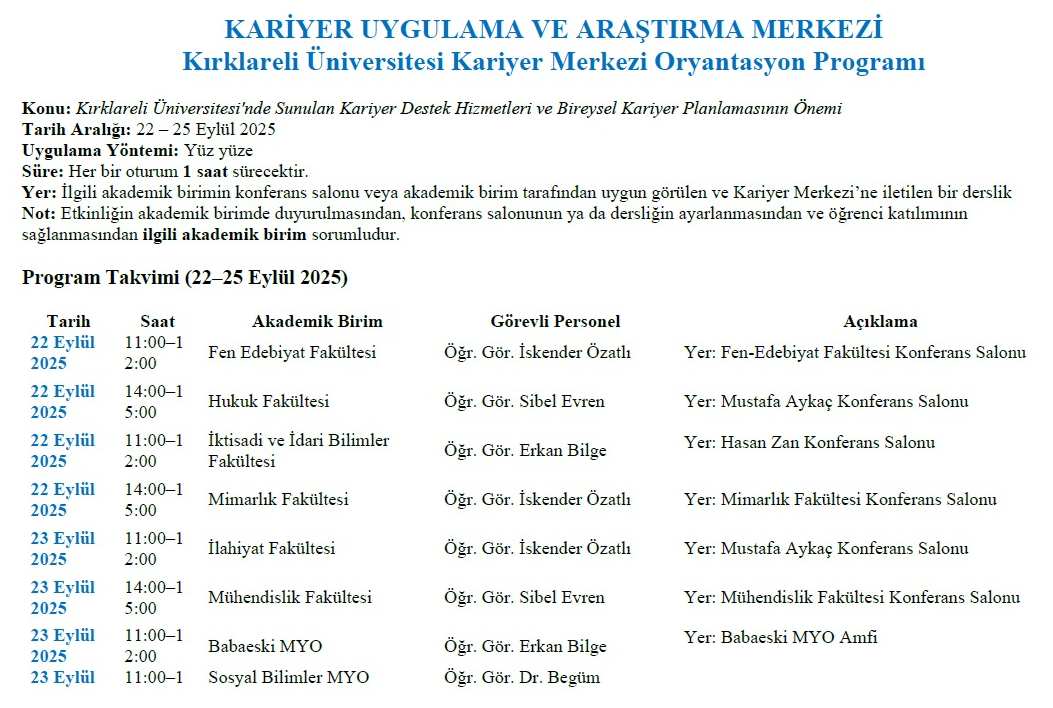23 Eylül 2025 tarihi 14:00–15:00 saatleri arasında Mühendislik Fakültesi Konferans Salonunda Kariyer Merkezi tarafından Oryantasyon Programı düzenlenecektir.