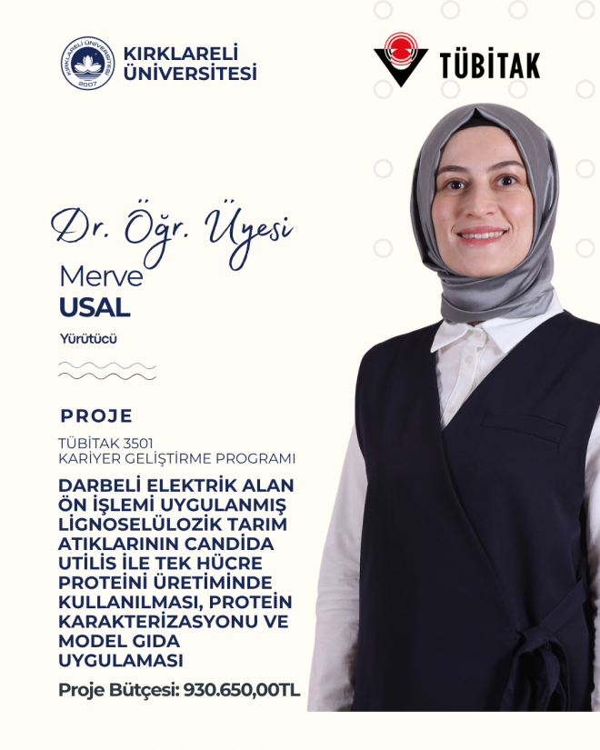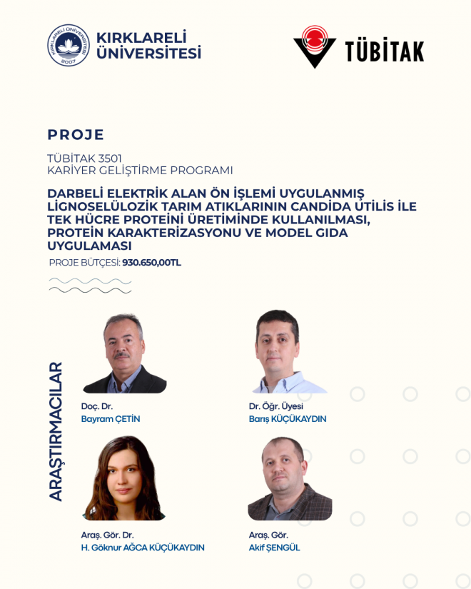 Mühendislik Fakültesi Gıda Mühendisliği Bölümü Öğretim Üyesi Dr. Öğr. Üyesi Merve USAL'ın yürütücülüğünü üstlendiği Doç. Dr. Bayram ÇETİN ve Arş. Gör. Dr. H. Göknur AĞCA KÜÇÜKAYDIN ile birlikte bölümümüz öğretim elemanları Dr. Öğr. Üyesi Barış KÜÇÜKAYDIN ve Arş. Gör. Akif ŞENGÜL’ün araştırmacı olarak görev aldığı “Darbeli Elektrik Alan Ön İşlemi Uygulanmış Lignoselülozik Tarım Atıklarının Candida utilis ile Tek Hücre Proteini Üretiminde Kullanılması, Protein Karakterizasyonu ve Model Gıda Uygulaması” başlıklı proje, TÜBİTAK 3501 Kariyer Geliştirme Programı kapsamında desteklenmeye hak kazanmıştır.